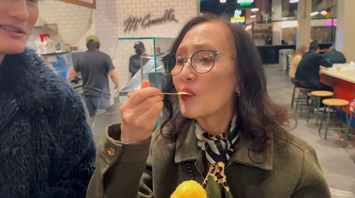 吃完主食就是餐后甜品,尹子维给妈妈买了一个冰淇淋,80岁的胡燕妮也完全不忌口,大口大口吃着冰淇淋,像个小孩子一样,真没几个80岁老人像胡燕妮这样精神,这身体素质是真让人羡慕。